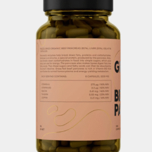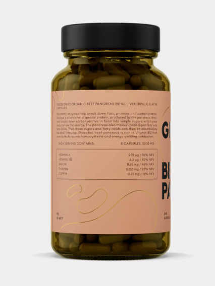 Skład: liofilizowana trzustka wołowa (80%), liofilizowana wątroba wołowa (20%), kapsułka żelatynowa